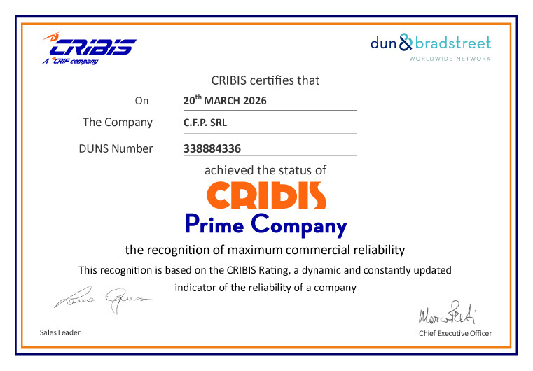 The CRIBIS recognition obtained by CFP Pressofusione represents an important confirmation of our company’s strength and of the path we pursue every day with reliability, transparency, and professionalism. This certification reinforces the value of our company in the eyes of customers, partners, and suppliers, demonstrating the presence of a serious, well-organized structure focused on continuity.